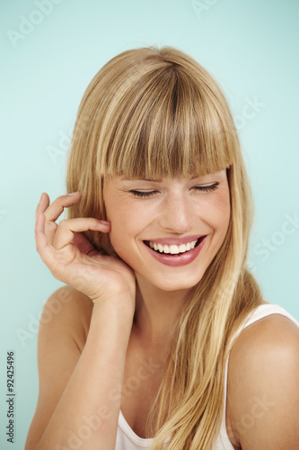 © sanneberg, Obraz premium Laughing young lady in blue studio