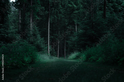 Obraz premium Launischer grüner Wald in Dunkelheit. Naturfoto