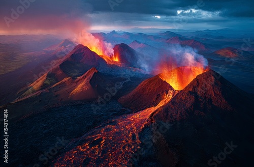 © Fathor, Fototapeta premium Lava and smoke erupting from the volcano on an island in Iceland, view of mountains with lava flowing down, colorful red and orange color palette, blue sky, aerial photography, photo-realistic