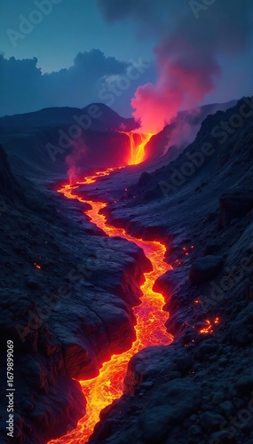 Fototapeta premium Lava flows from a volcanic vent in Hawaii, creating a dramatic landscape of fire and rock The molten rock glows intensely against the dark night sky , volcanic activity, creation