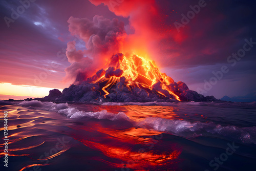 © photosaint, Naklejka premium Lava flows from an erupting volcano under a dramatic sunset sky on a remote island landscape
