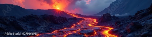 Naklejka premium Lava flows slowly down the slope of a volcano, flow, land, geological
