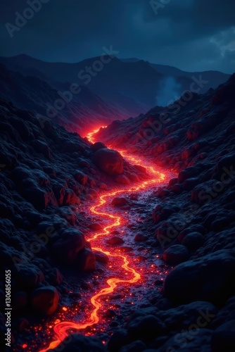 © Jame, Fototapeta premium Lava flows through a volcanic crater at night, rocks, natural