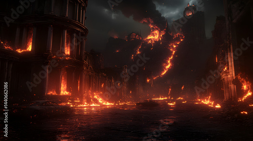 Obraz premium Lava surges through the skeleton of an abandoned city, igniting old buildings...