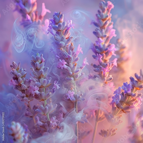 © Riz, Naklejka premium Lavender Blooms and Wispy Smoke in Soft Pastel Hues