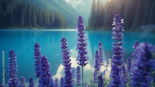 © ngamaz, Fototapeta premium Lavender blooms by serene mountain lake