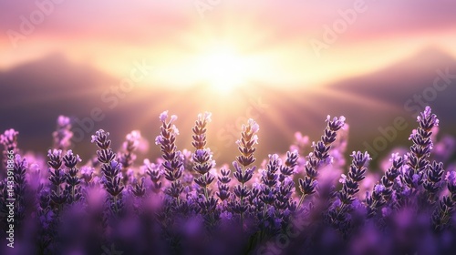 Naklejka premium Lavender blooms softly bask in the warm golden rays of the sunset that drape over the majestic mountain landscape, creating a truly serene and captivating natural setting