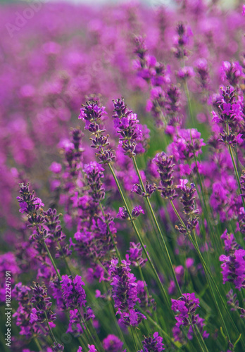 © yanadjan, Naklejka premium Lavender blossoms in a beautiful background field. Selective focus.