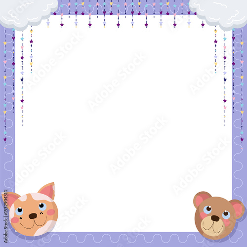 Fototapeta premium Lavender border is showing clouds, hanging stars, hearts, cartoon animal...