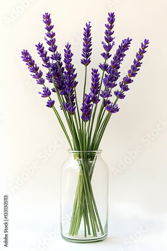 Naklejka premium Lavender bouquet in a clear glass vase against a white background