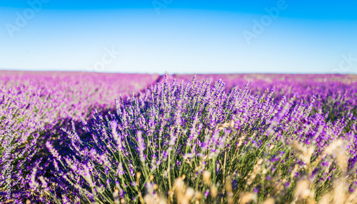 © Daniel, Naklejka premium Lavender bushes closeup on sunset. Sunset gleam over purple flowers of lavender. Bushes on the center of picture and sun light on the left. Provence region of france.