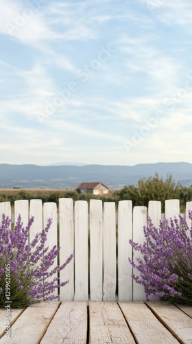 © logitech, Fototapeta premium Lavender bushes in front of white fence, countryside view