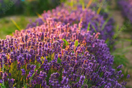 Naklejka premium Lavender bushes in row, blooming under warm sunlight in peaceful purple and...