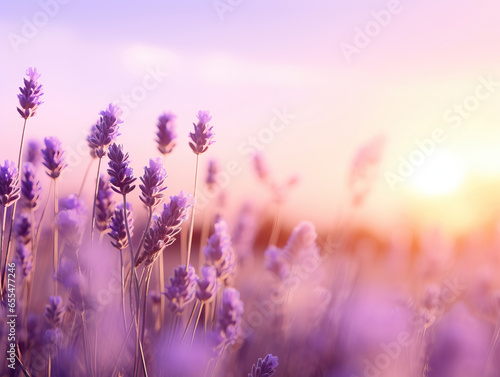 © Worrapol, Naklejka premium lavender field and the sunset behind. generative ai