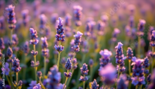 Fototapeta premium Lavender Field at Dawn A close up of lavender flowers bathed in morning...
