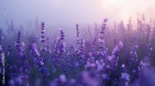 Fototapeta premium Lavender field at dawn, crisp purple blooms highlighted against the early morning mist, evoking a sense of calm and quiet beauty