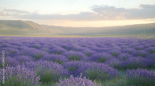 Fototapeta premium Lavender field at dawn, rolling hills, peaceful scene, suitable for nature...