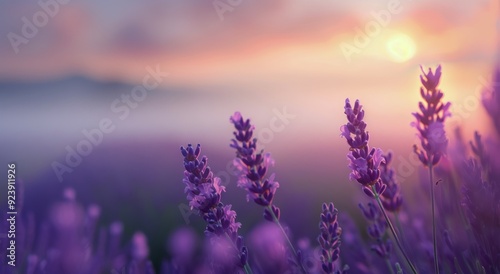 Fototapeta premium Lavender Field at Sunrise With Soft Purple Blooms and Misty Background
