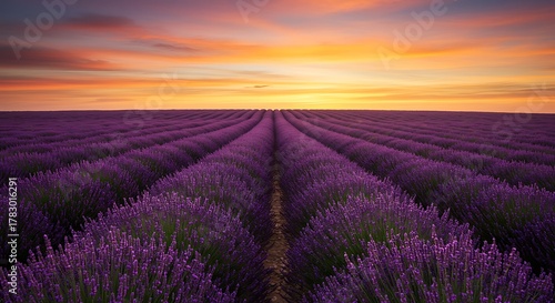 © Edi, Fototapeta premium Lavender Field at Sunset - A Serene Landscape of Purple and Gold.