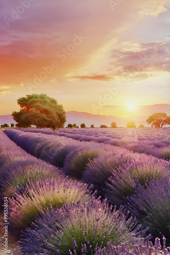 Fototapeta premium Lavender Field at Sunset. Capturing Nature’s Tranquil Beauty. Travel and Tourism, Environmental Appreciation.