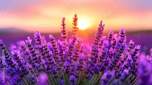 Fototapeta premium Lavender field at sunset, vibrant colors, beautiful flowers. Possible use...