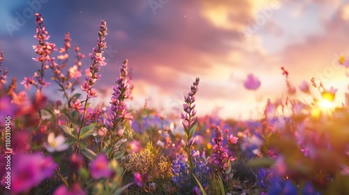 Naklejka premium Lavender field at sunset with blooming flowers in purple, violet, and pink hues
