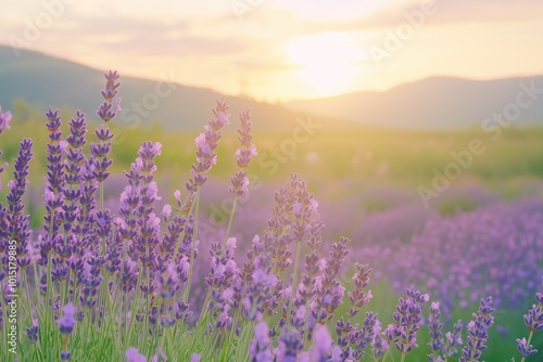 Fototapeta premium Lavender field at sunset with golden light illuminating serene purple flowers in a tranquil rural landscape