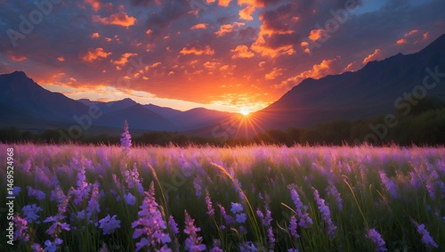 © Tina, Fototapeta premium Lavender Field at Sunset with Mountain Backdrop and Dramatic Sky