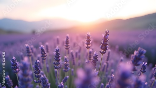Naklejka premium Lavender field at sunset with mountains in the background. Purple flowers at...