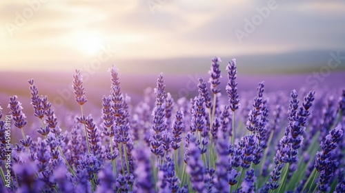 © Lumevia, Fototapeta premium Lavender field bathed in golden sunset light.