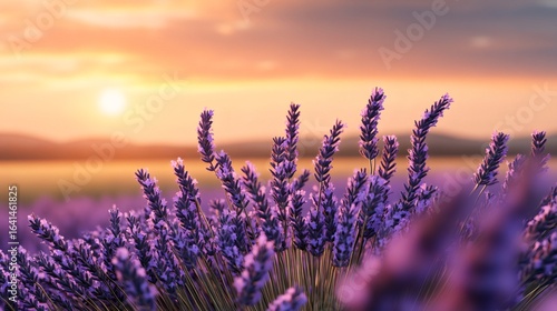 © creative, Naklejka premium Lavender field bathing in golden sunset light
