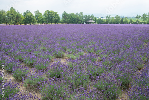© Kitinut, Fototapeta premium Lavender field blooming in rural landscape with trees and distant hills at Hokkaido, Japan