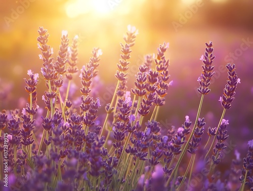 Naklejka premium Lavender Field Blooms at Sunset with Warm Glowing Light and Haze