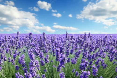 Naklejka premium Lavender field blooms under a bright blue sky with fluffy clouds in springtime