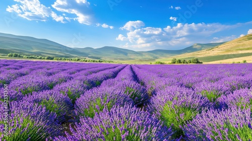 Naklejka premium Lavender field expanse, mountain backdrop, sunny day