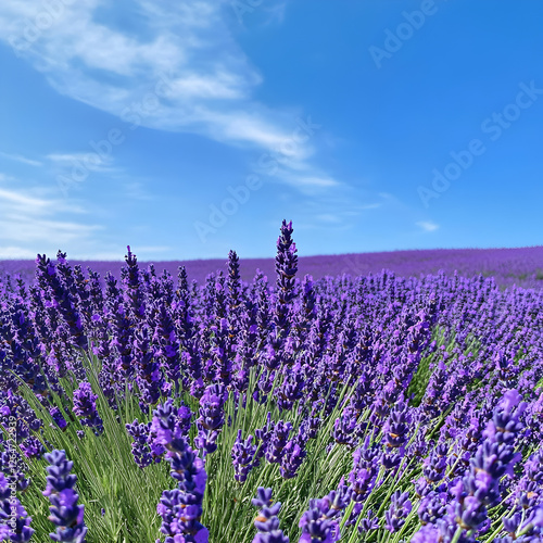 © Atirut, Naklejka premium Lavender Field in Bloom: A vibrant field of lavender stretches towards the horizon under a clear, cerulean sky, creating a sense of tranquility and natural beauty.