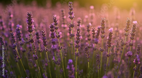 Naklejka premium Lavender Field in Golden Light: Aromatic Purple Bloom
