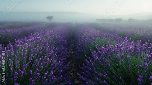 © Cornflakesei, Fototapeta premium Lavender Field in Morning Mist