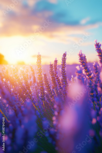 © Aquir, Naklejka premium Lavender field in morning sun. Blooming lavender in Provence, France