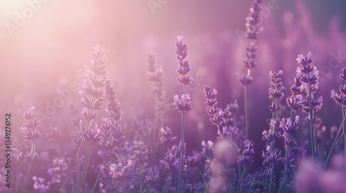 © budi, Fototapeta premium Lavender field in soft sunlight, showcasing blooming flowers and a serene atmosphere in the background