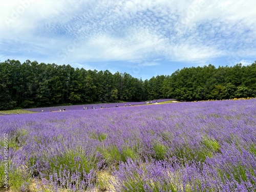 © JWSmile, Naklejka premium Lavender Field in summer at Irodori Field, Farm Tomita, Furano, Hokkaido, Japan. A popular summer sight. The purple flowers create a contrast against the lush green trees and clear blue sky.