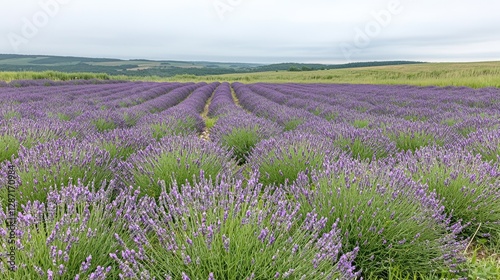 Naklejka premium Lavender field rows in countryside landscape. Possible use stock photo