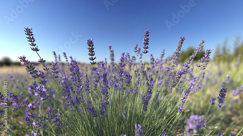 Naklejka premium Lavender Field Serenity: A close-up view of a vibrant lavender field under a clear blue sky. The purple blooms create a breathtaking spectacle, capturing the essence of tranquility and natural beauty.