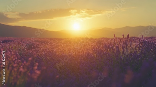 Obraz premium lavender field stretching into the distance under a golden sunset, radiating...