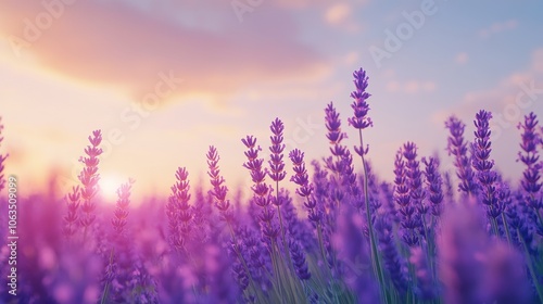 Fototapeta premium Lavender field stretching toward the horizon, vivid purple blossoms reaching up to meet a pristine sky; the setting evokes the refreshing, cool climate of a countryside.