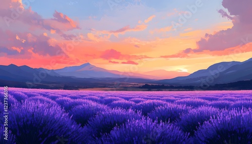Fototapeta premium Lavender Field Sunset Mountain Landscape