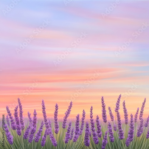 Fototapeta premium Lavender Field Under Colorful Sky at Sunset with Soft Clouds