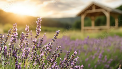 Naklejka premium Lavender Field under Golden Sunset with Rustic Shelter in Background Showcasing Nature's Serenity and Beauty