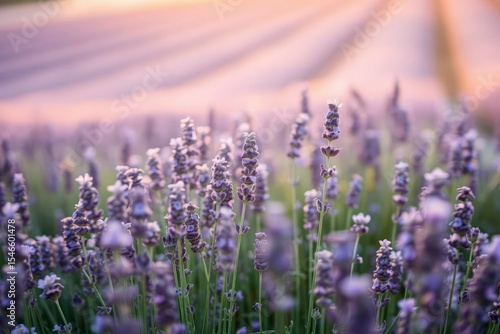 © Isymam, Naklejka premium Lavender field under soft diffused light focusing on rows of purple flowers