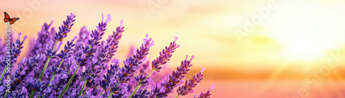 Obraz premium Lavender field with butterfly at sunset, creating serene atmosphere